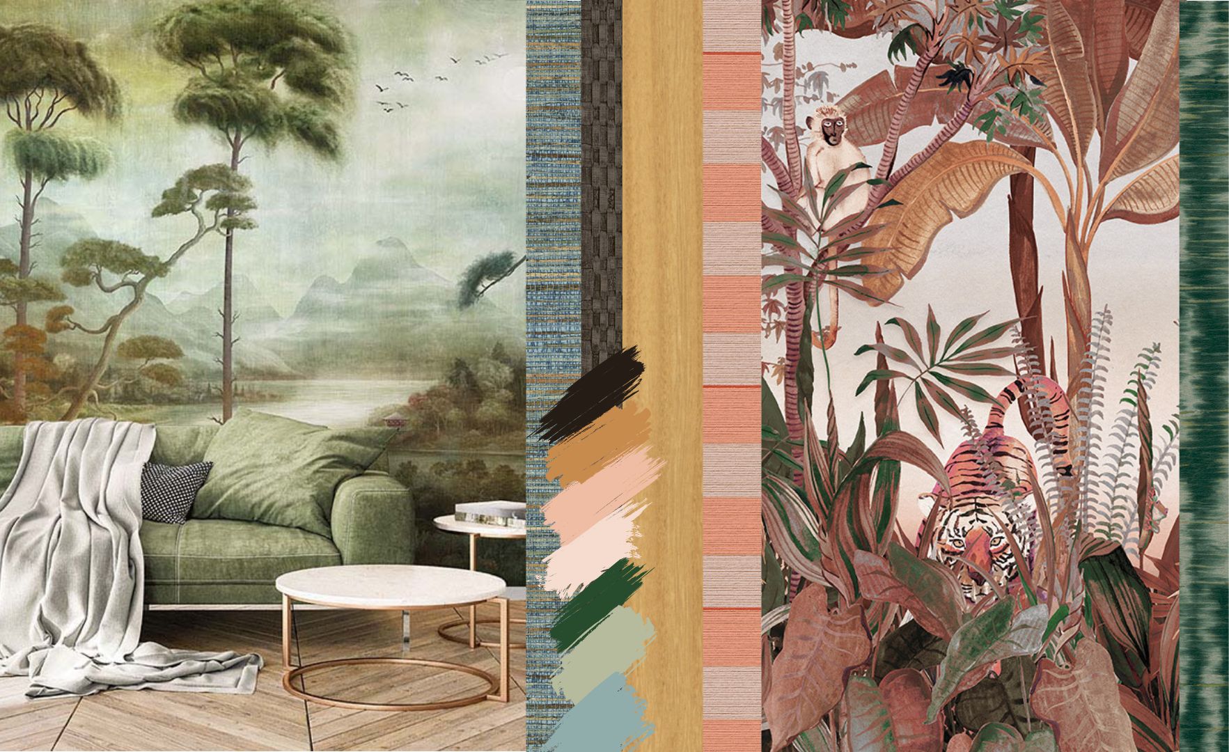 Tips for Use: Use soft grey greens and blues in bathrooms, bedrooms, or any space where you want to promote relaxation and tranquillity. Pair with deeper hues like cocoa and moody greens for a cohesive, nature-inspired look. Imagine a nature-inspired wallpaper or mural to capture the mood you’re longing for.