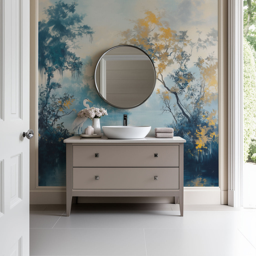 Transform your space with the Magic Moment mural, capturing a serene early morning pond scene. Featuring fresh blue hues with touches of golden light, and a majestic egret calmly surveying the reflective water, this artwork brings a peaceful and enchanting atmosphere to any room. Ideal for creating a tranquil environment, its natural beauty and subtle details invite relaxation and contemplation.