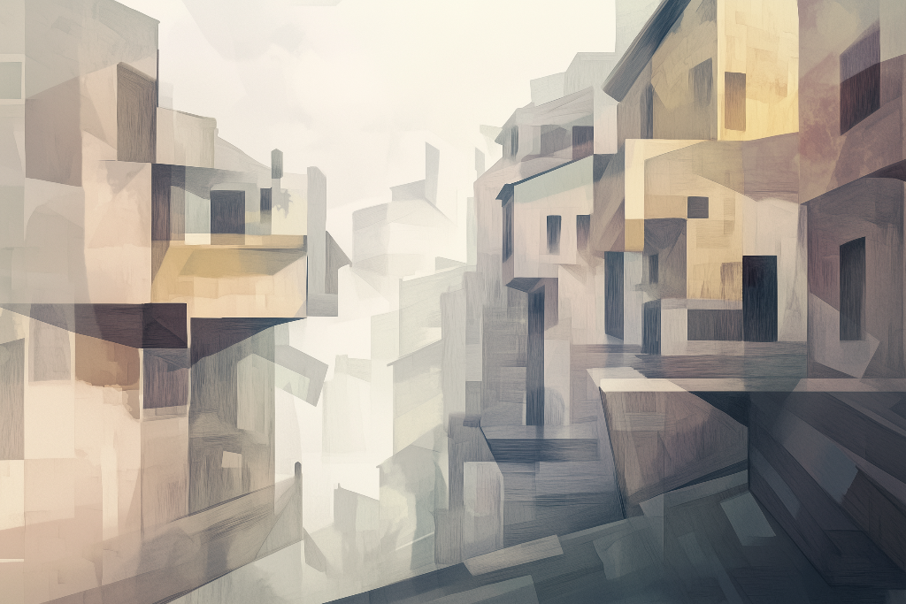 Transform your space with this intriguing mural depicting dwellings in a dynamic urban composition. Rendered in a carefully curated neutral palette enriched with warm sienna accents, the design employs a layered transparency that creates remarkable depth and visual intrigue. Soft textural elements enhance the walls, while multiple perspectives and overlapping planes establish a contemporary aesthetic. Ideal for a home office or corporate office space.