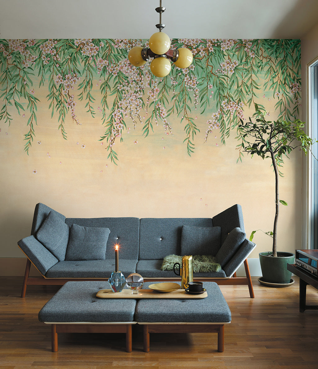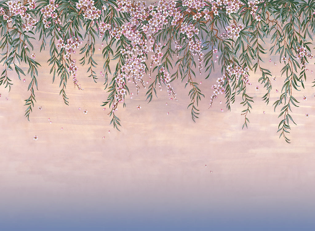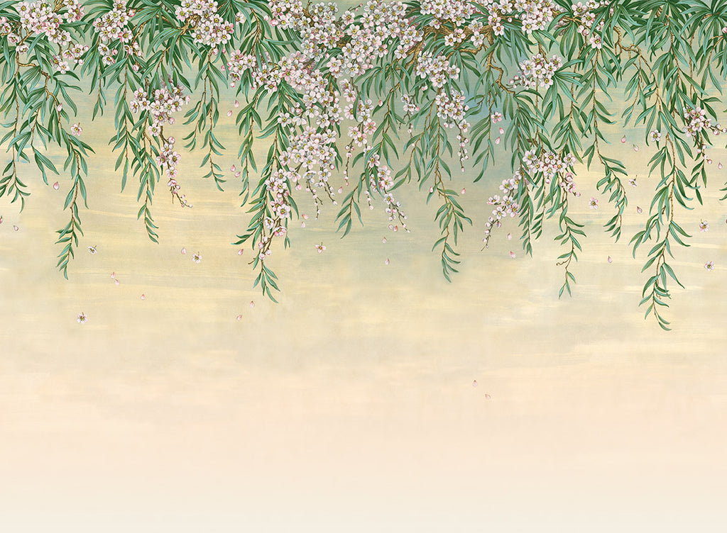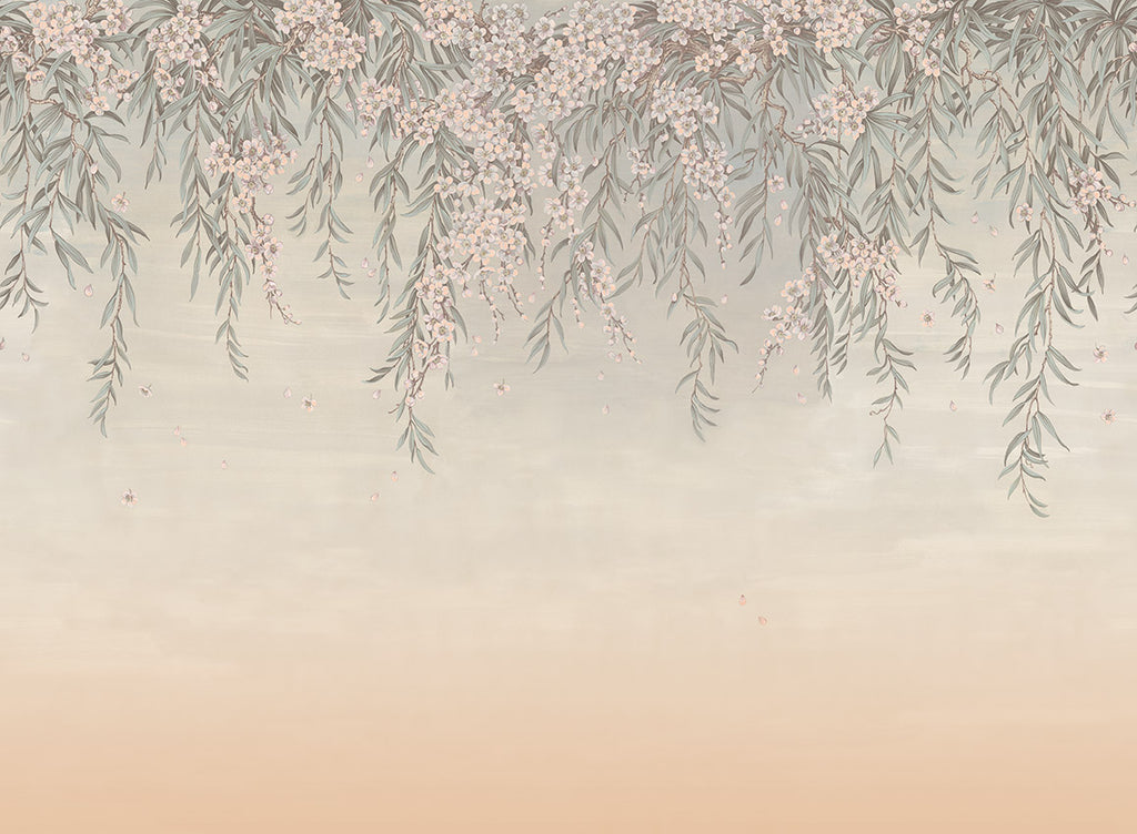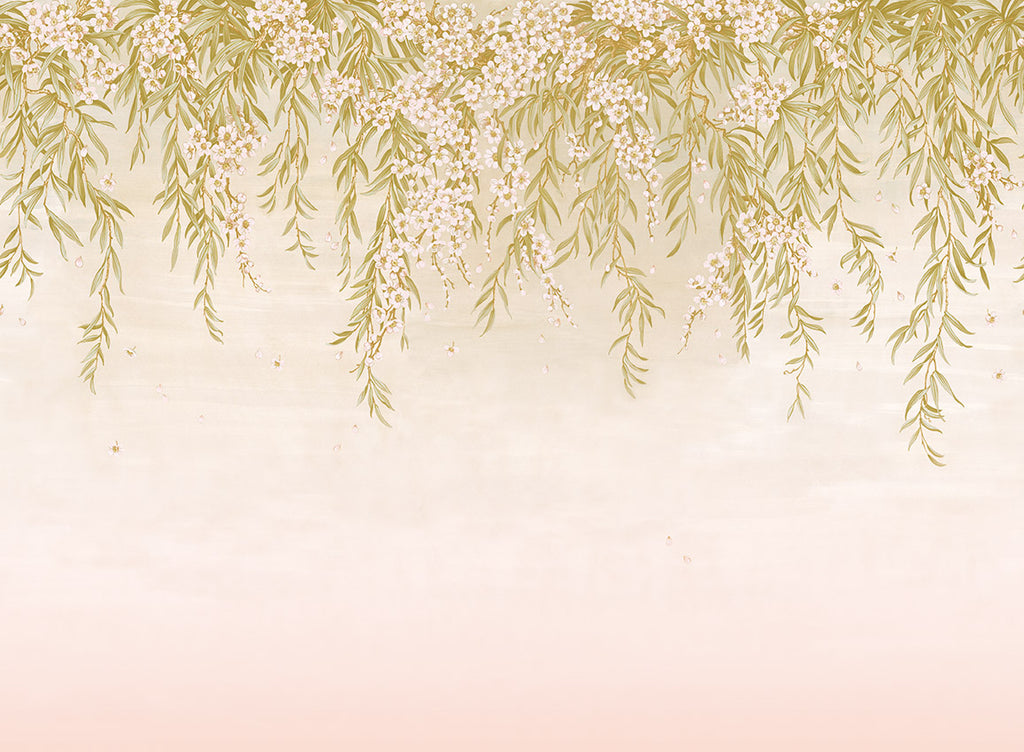 Transform your space with this enchanting mural featuring delicate trailing leaves and blossoms rendered in soft, dreamy pastels. The whimsical composition creates an ethereal atmosphere, perfect for bedrooms, nurseries, or creative studios seeking a fresh, botanical aesthetic. Each brushstroke captures the gentle movement of nature, bringing an air of tranquility and sophistication to your walls. This expressive artwork is printed on a textured vinyl substrate, providing a rich, tactile surface.