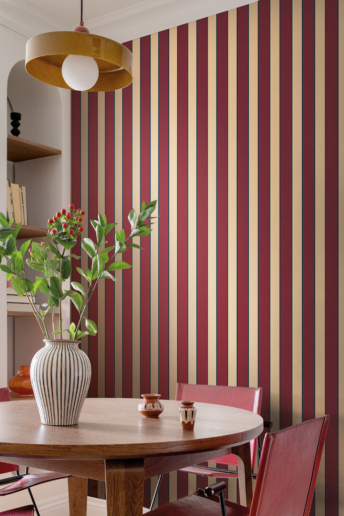 Stripes represent order and movement, and the Linearis Zenit wallpaper reveals them in 3 dramatic  variations. Featuring 2 broad bands of colour with a 3rd narrow accent colour, this wallpaper is printed on a lovely ribbed vinyl that mimics woven fabric. The textured finish combines visual appeal with practical durability as it's fully washable, easy to install, and strips away easily when you're ready for a change. Perfect for creating a striking feature wall or refreshing an entire room with timeless sophistication.